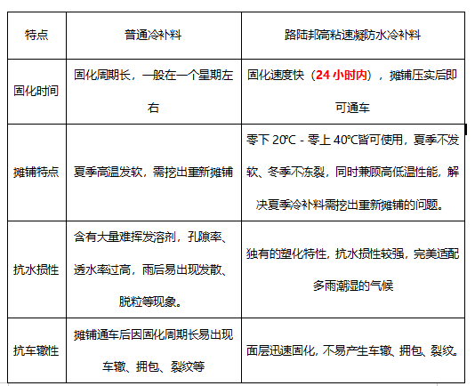 二、路陸邦高粘速凝防水冷補(bǔ)料在市場(chǎng)的優(yōu)勢(shì):