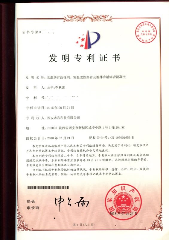 今年8月,我公司“常溫瀝青改性劑、常溫改性瀝青及溫拌冷鋪瀝青混凝土”發(fā)明通過國家知識產(chǎn)權局審查,授予專利權,并頒發(fā)發(fā)明專利證書。