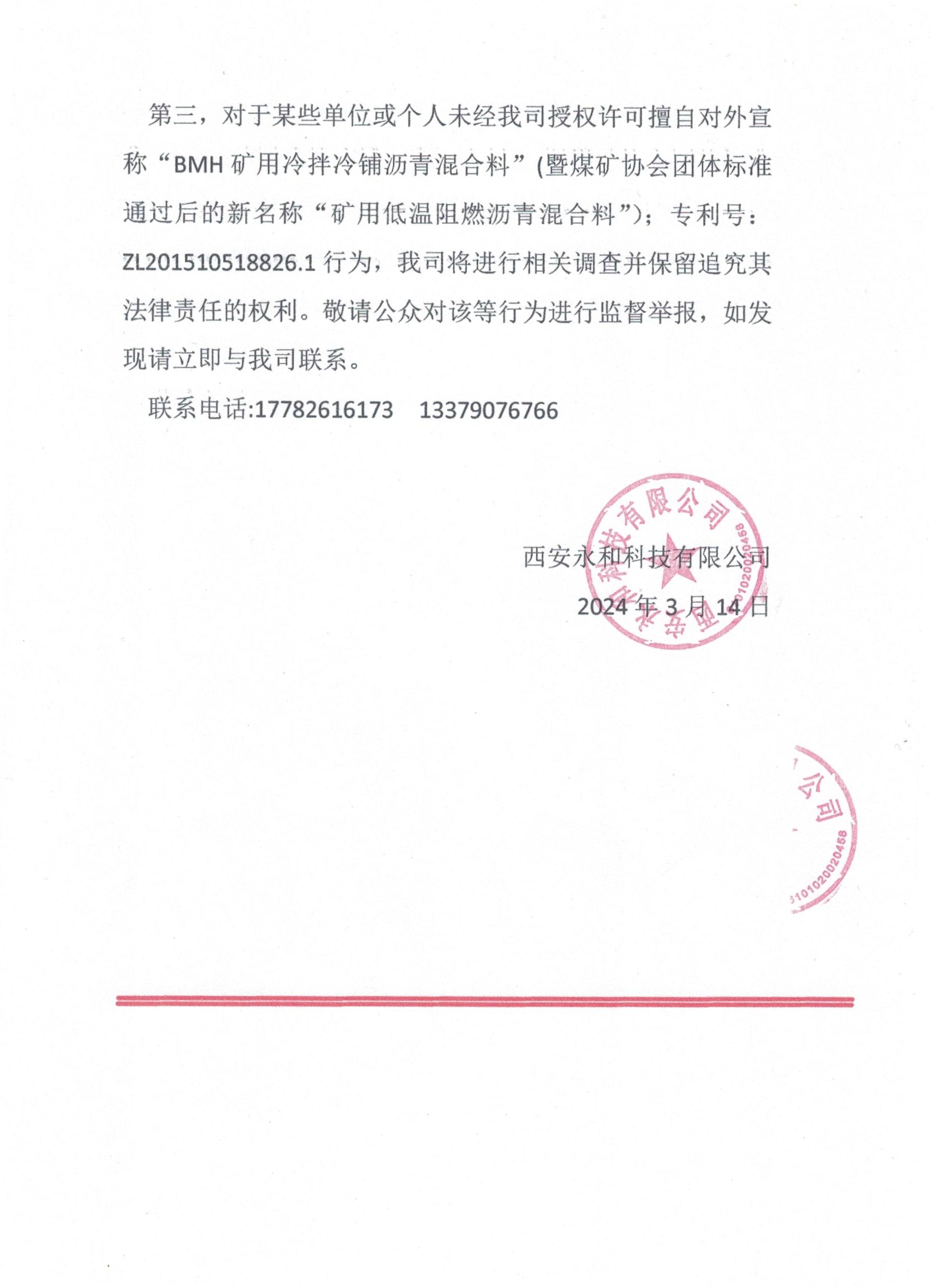 BMH礦用冷拌冷鋪瀝青材料授權(quán)聲明